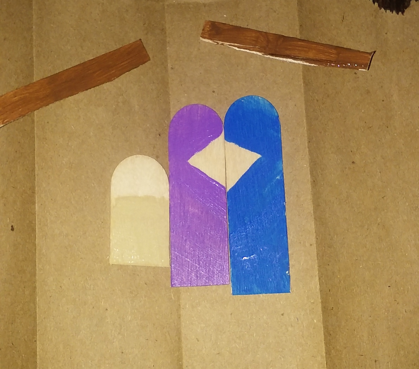 Step #4 : Time to paint. Make sure you paint leaving a "<" shape FREE of paint for the faces of Mary and Joseph. One "<" and the other ">" because they will BOTH be facing the manger. Paint 3/4 of baby Jesus in cream to represent the swaddling cloth. Also paint the manger and set aside to dry.